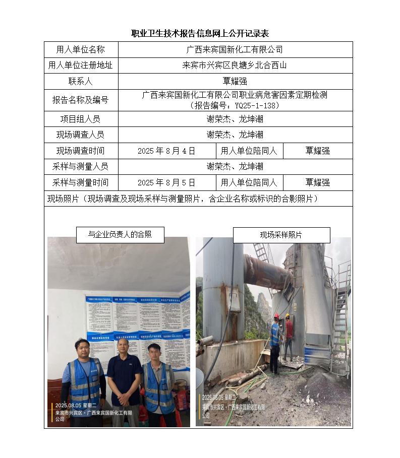 廣西來賓國新化工有限公司職業(yè)病危害因素定期檢測 (報告編號:YQ25-1-138)