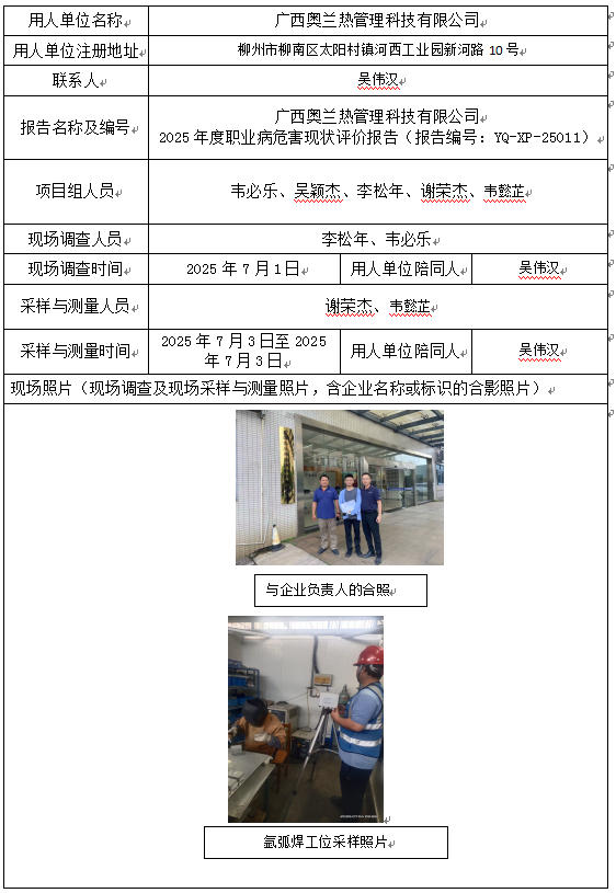 廣西奧蘭熱管理科技有限公司 2025年度職業(yè)病危害現(xiàn)狀評價報告